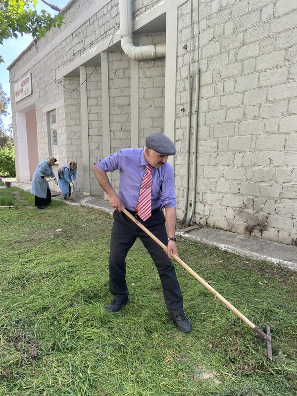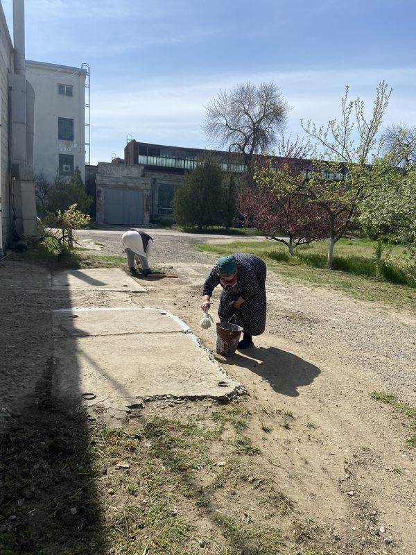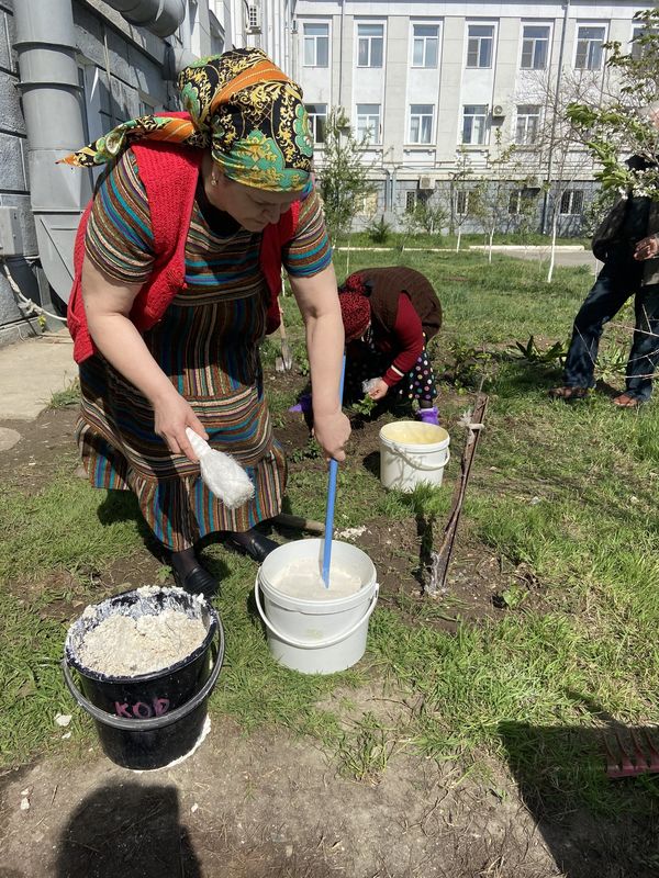 С девяти утра началась работа по благоустройству территории завода: разрыхлили землю вокруг деревьев, подмели дорожки около зданий, побелили деревья и бордюры, скосили траву. Пока одни работали на улице, другие работники наводили порядок на рабочих местах, в цехах и офисах.